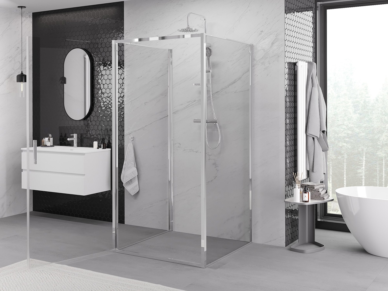 Mexen Exo-3S háromfalú nyíló zuhanykabin 85 x 85 cm, átlátszó, króm - 817-085-085-01-00-3S