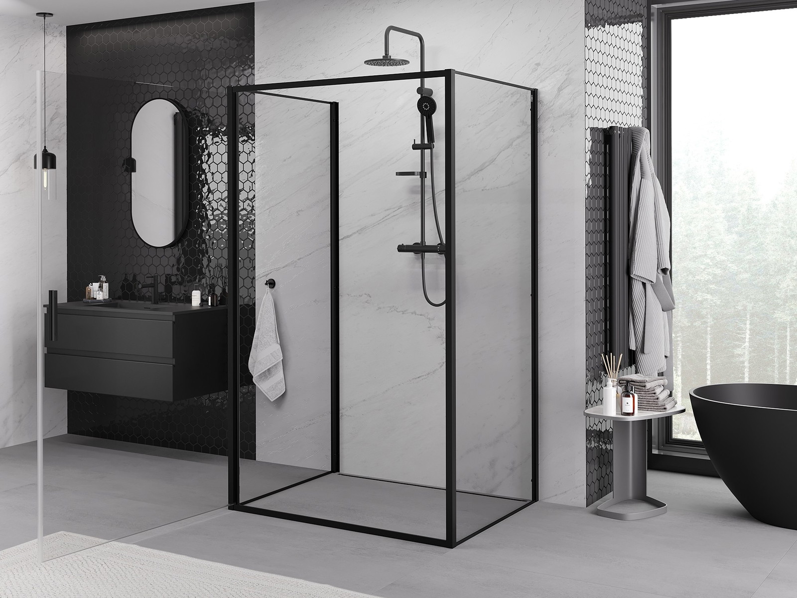 A praktikus és kényelmes fogantyú tartós és ellenálló fémből készült. A divatos forma a profilok színéhez igazított kivitelezéssel együtt modern és stílusos megjelenést kölcsönöz az egésznek, kiemelve minden fürdőszoba esztétikáját.