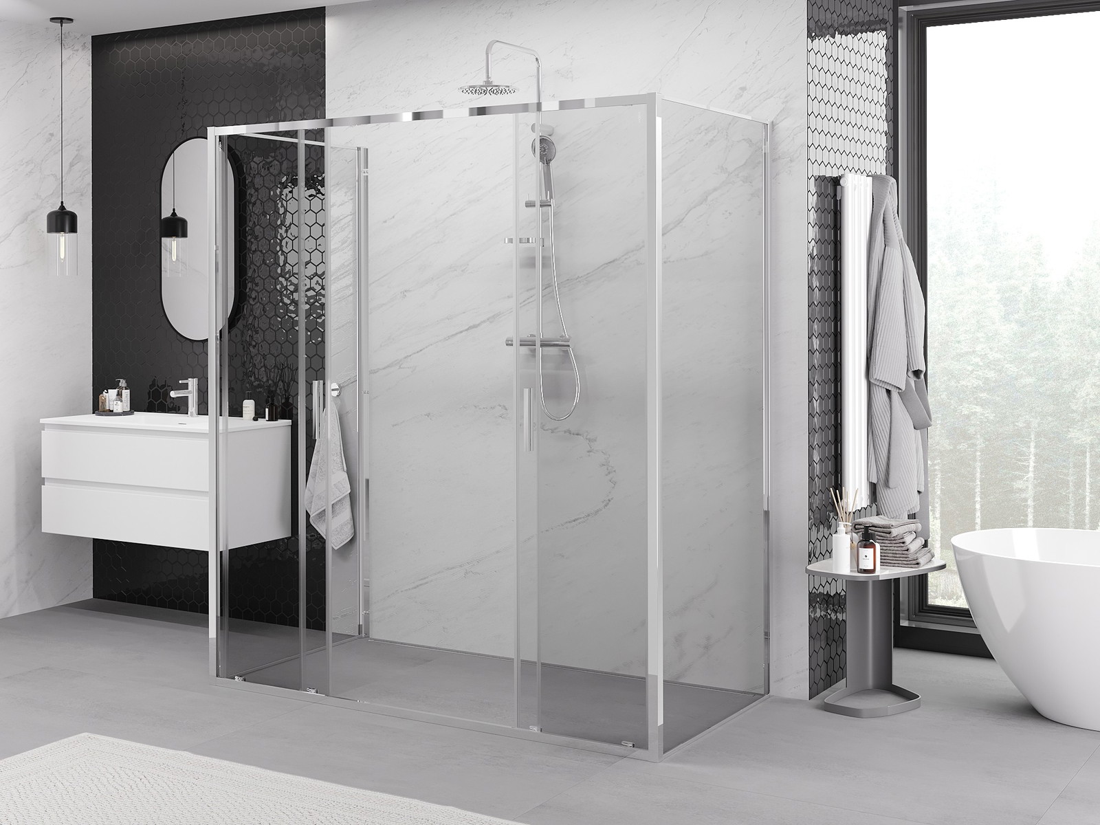 A praktikus és kényelmes fogantyú tartós és ellenálló fémből készült. A divatos forma a profilok színéhez igazított kivitelezéssel együtt modern és stílusos megjelenést kölcsönöz az egésznek, kiemelve minden fürdőszoba esztétikáját.