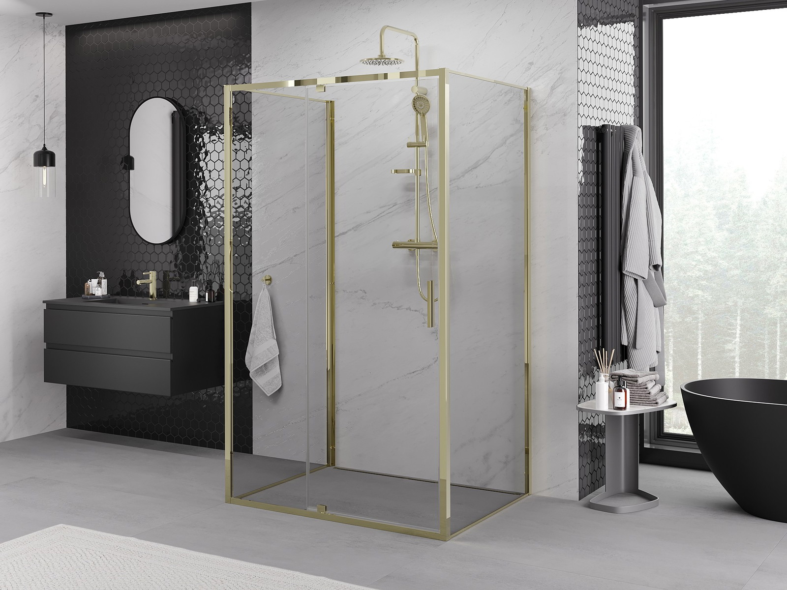 A praktikus és kényelmes fogantyú tartós és ellenálló fémből készült. A divatos forma a profilok színéhez igazított kivitelezéssel együtt modern és stílusos megjelenést kölcsönöz az egésznek, kiemelve minden fürdőszoba esztétikáját.