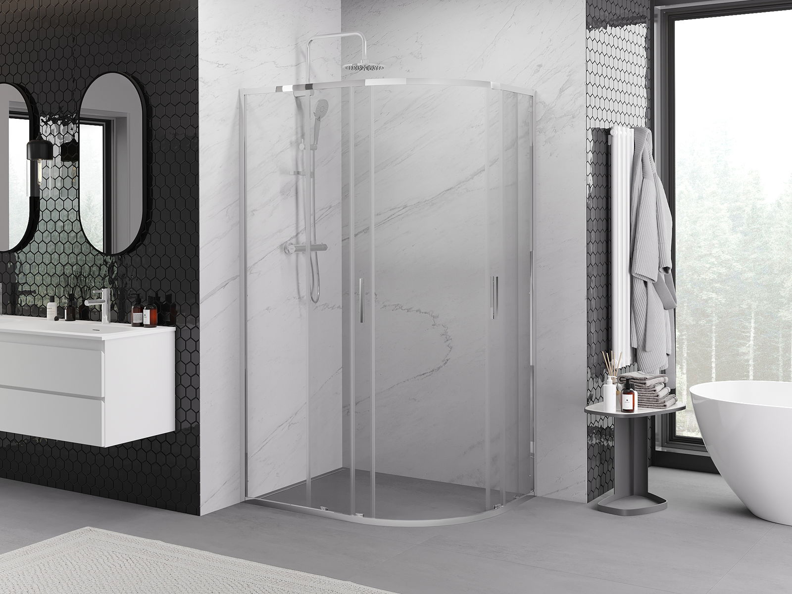 Mexen Exo félköríves aszimmetrikus tolóajtós zuhanykabin, 120 x 80 cm, átlátszó, króm - 8132-120-080-01-00