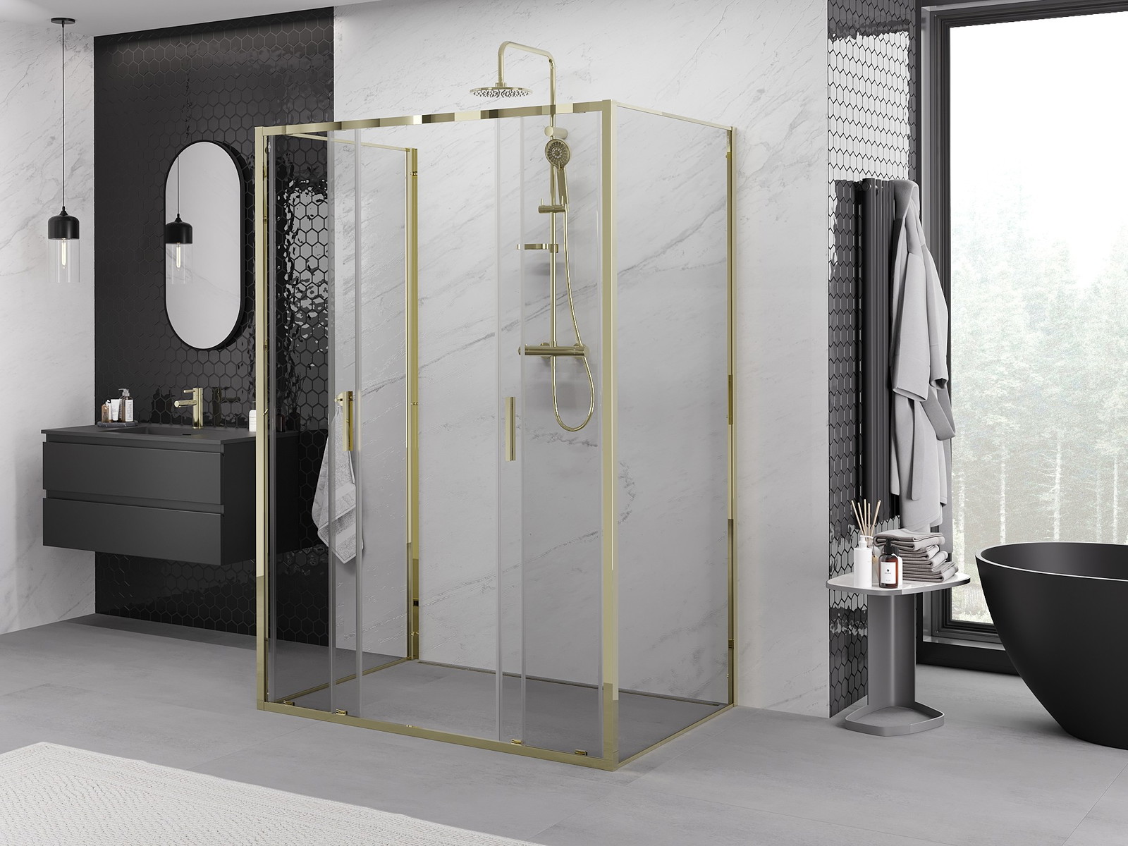 Mexen Exo-3S 3-falú zuhanykabin, tolóajtós, 140 x 100 cm, átlátszó, arany - 8152-140-100-50-00-3S