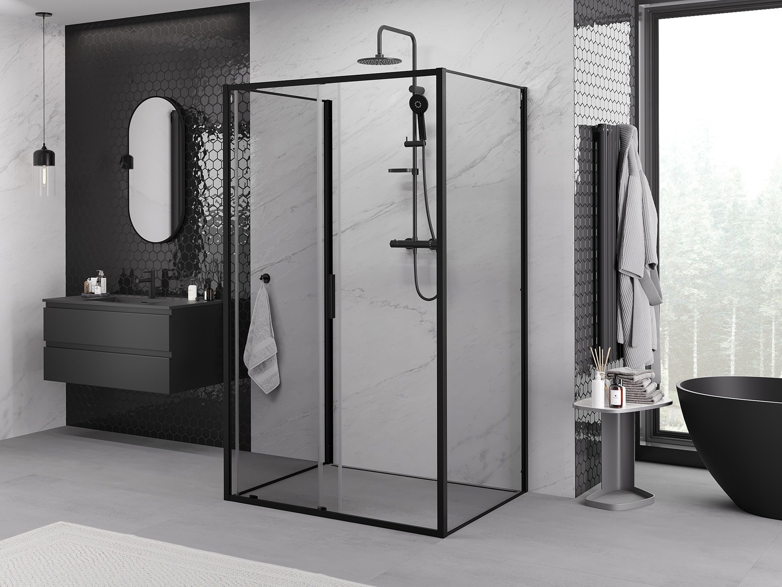 Mexen Exo-3S 3-falú, tolóajtós zuhanykabin 90 x 110 cm, átlátszó, fekete - 8151-090-110-70-00-3S